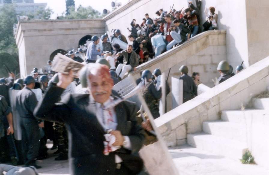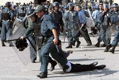 October 16, 2003 Demonstrators respond to the attack by armed forces. ¿Erazm Ciolek